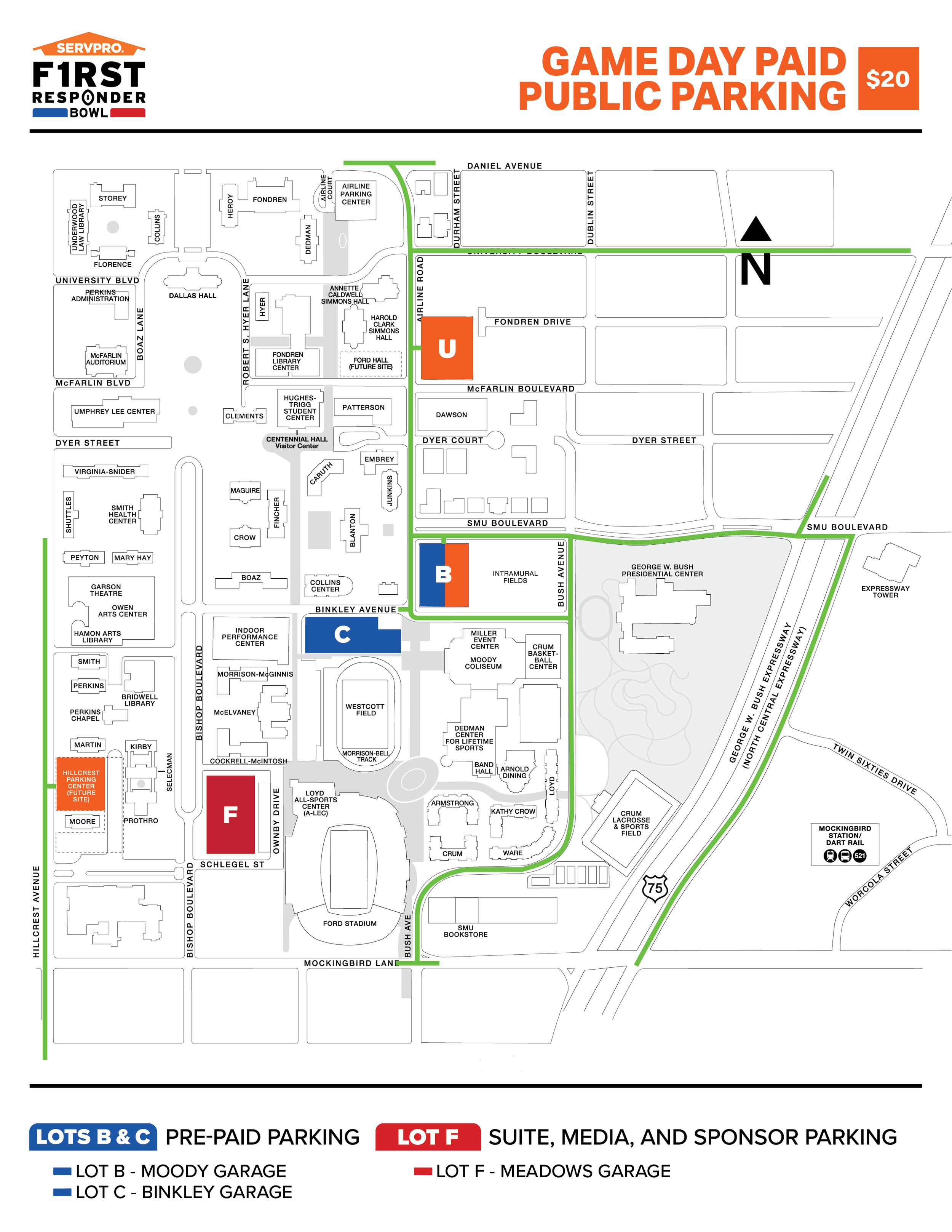 Gerald J. Ford Stadium is located in the neighborhoods that surround the SMU Campus and traffic can get congested if you do not preplan your visit, especially for visiting fans that may not be familiar with the area. ADA parking is located on a first come first serve basis in each parking lot.